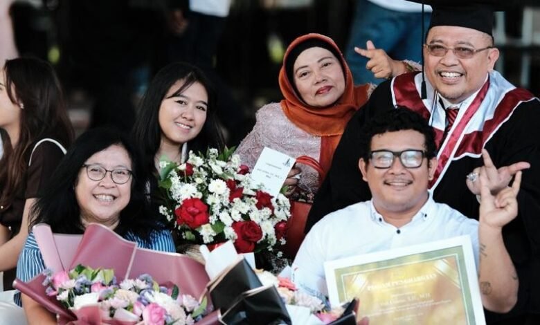 “Saya sampai menangis karena bahagia, dan ini benar-benar suprise melihat dia diwisuda hari ini,” ujar pengacara yang terkenal kalem ini.